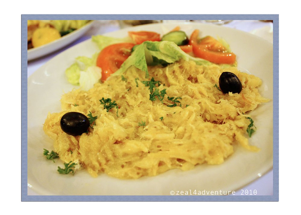 After a good couple of hours, we were famished (even after all the goodies we bought and sampled). In a cozy looking restaurant in one of the alleys in St. Dominic’s Square, I had a Bacalhau à bras – salted cod fish sautéed with potatoes, onion and eggs, in short, a bacalhau omelette. 🙂