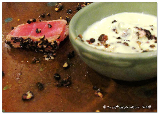 Isn’t it obvious? So good it was gone before I knew it. Take my word for it… go for this. The tuna seared very briefly then sliced thinly and seasoned with freshly cracked pepper that gave the tuna a nice kick. Dipped in wasabi mayo… absolutely heaven. A great appetizer just before we moved on to the main dining hall.
