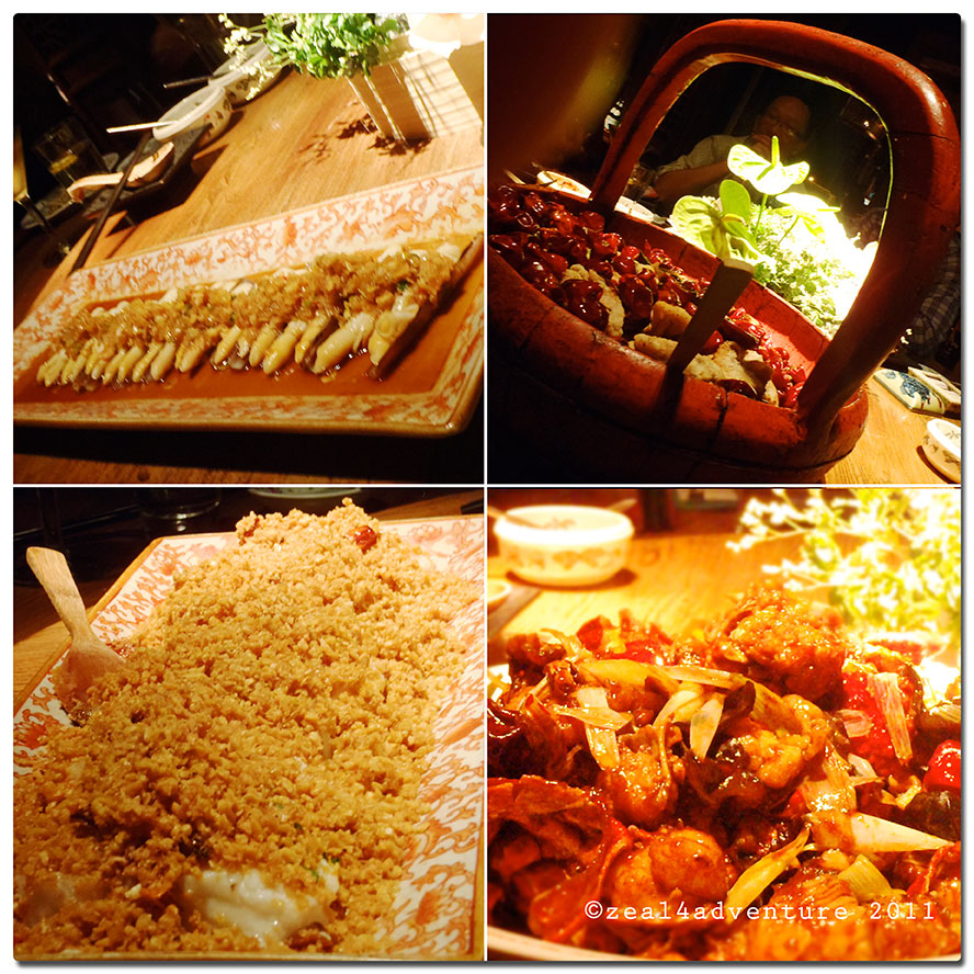 Clockwise: “Red Lantern” Crispy chicken w/ Sichuan red chili; Lobsters fried w/ red pepper & sweet chili sauce; Cod fillet tossed with fermented bean & chilis; Chili-spiced bamboo clams