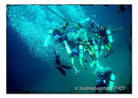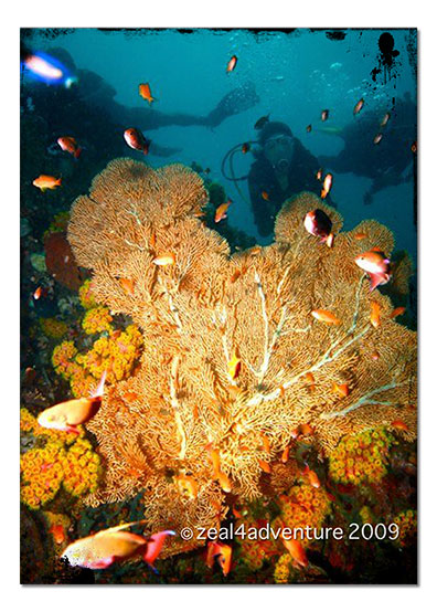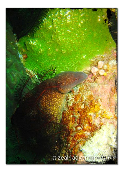 The island is essentially a wall dive made interesting with the overhangs, small caverns and holes in the reef wall. It was an easy dive with just the right currents. I was enjoying the drift, fascinated with all the marine life along the small caverns when divemaster taps me on the shoulder.