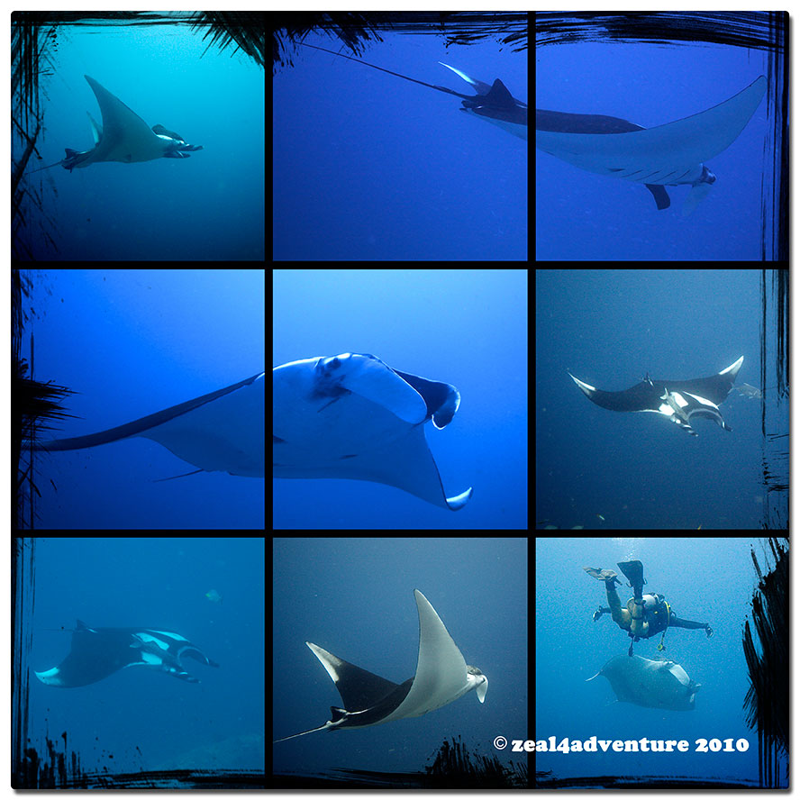 For three days, our schedule looked like this… up by 6, breakfast at 7, on the boat by 8, and at “The Valley” by 9. The mantas are there early, we were told. And they were indeed. As soon as we approached the station, they were there, at least 2 if not 3 at a time (except for the first day when they appeared 7 minutes before I had to deco, read: I only had less than 7 minutes before I have to ascend, or else! hehe!). And they did not disappoint. These gentle giants with wingspan of approximately 10-12 feet wide, were swimming, gliding gracefully above us, in front of us, all around us. Sometimes playing hide and seek, sometimes posing for the camera, sometimes just watching us, hovering so close above us we had to stay close to the ground or risk getting hit. An experience hard to top, eh?