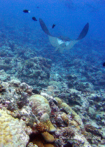 Somewhere near Blue Corner off the waters of Palau, a creature gracefully glided its way towards us.  It was my first encounter with rays and it was intoxicating.  Stupefied, I watched its flat disk-shape body with its soaring wings fly towards us.  It was identified as a Spotted Eagle Ray because it has white spots on its deep blue body.  Their long rounded snout, almost like a pig’s snout, distinguishes it from other rays.  The one encountered was quite big but it is said that a Spotted Eagle Ray can grow to nearly nine feet (3M) from wingtip to wingtip.
