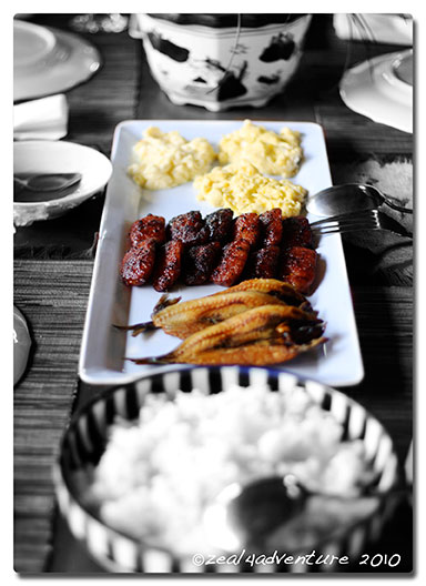 Our breakfast fare which include scrambled eggs, longganisa (local sausage) and a dried fried fish called Nora Aunor (no kidding!)