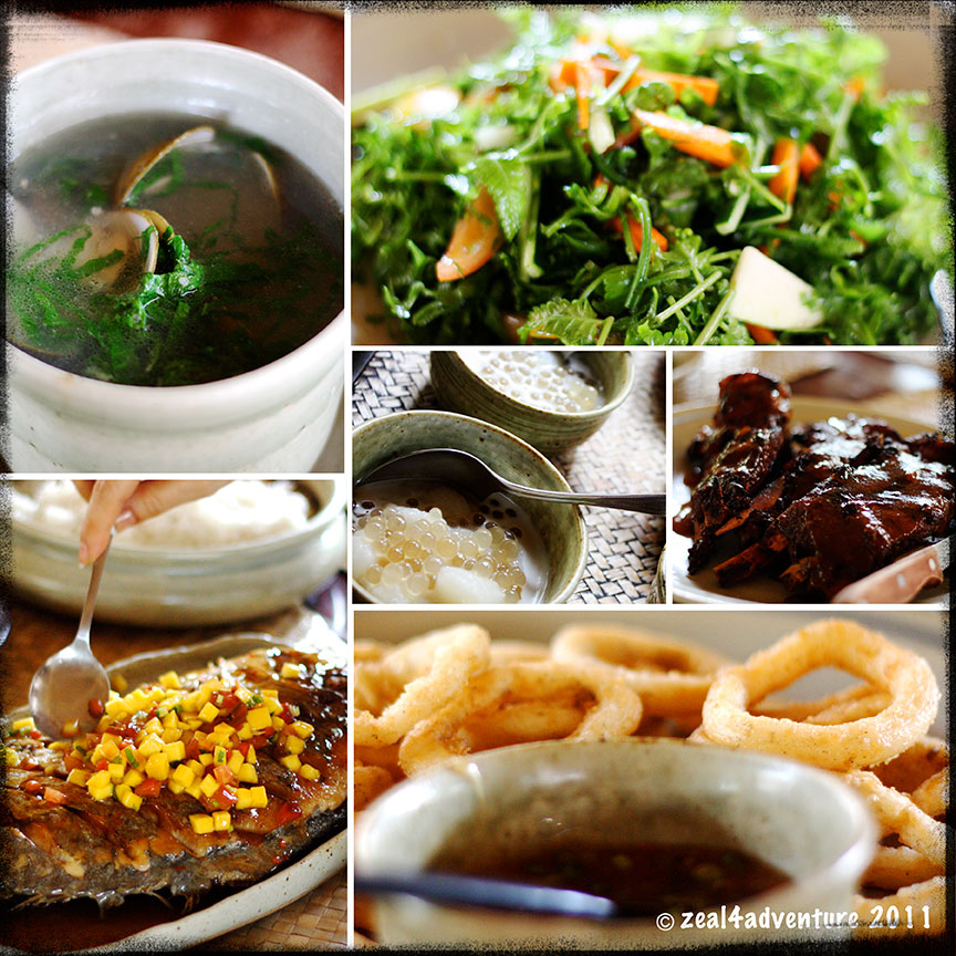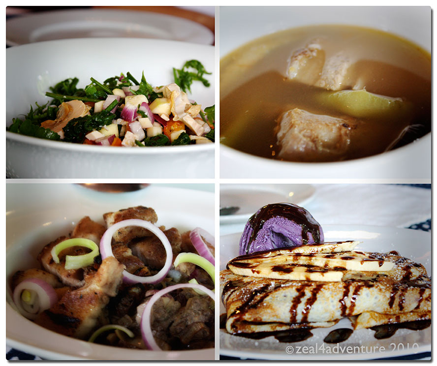 Clockwise: Enseladang Pako (Fiddelhead fern salad), Sinigang na Liempo, Banana crepe, Kulawong Puso ng Saging (an original recipe of San Pablo city).